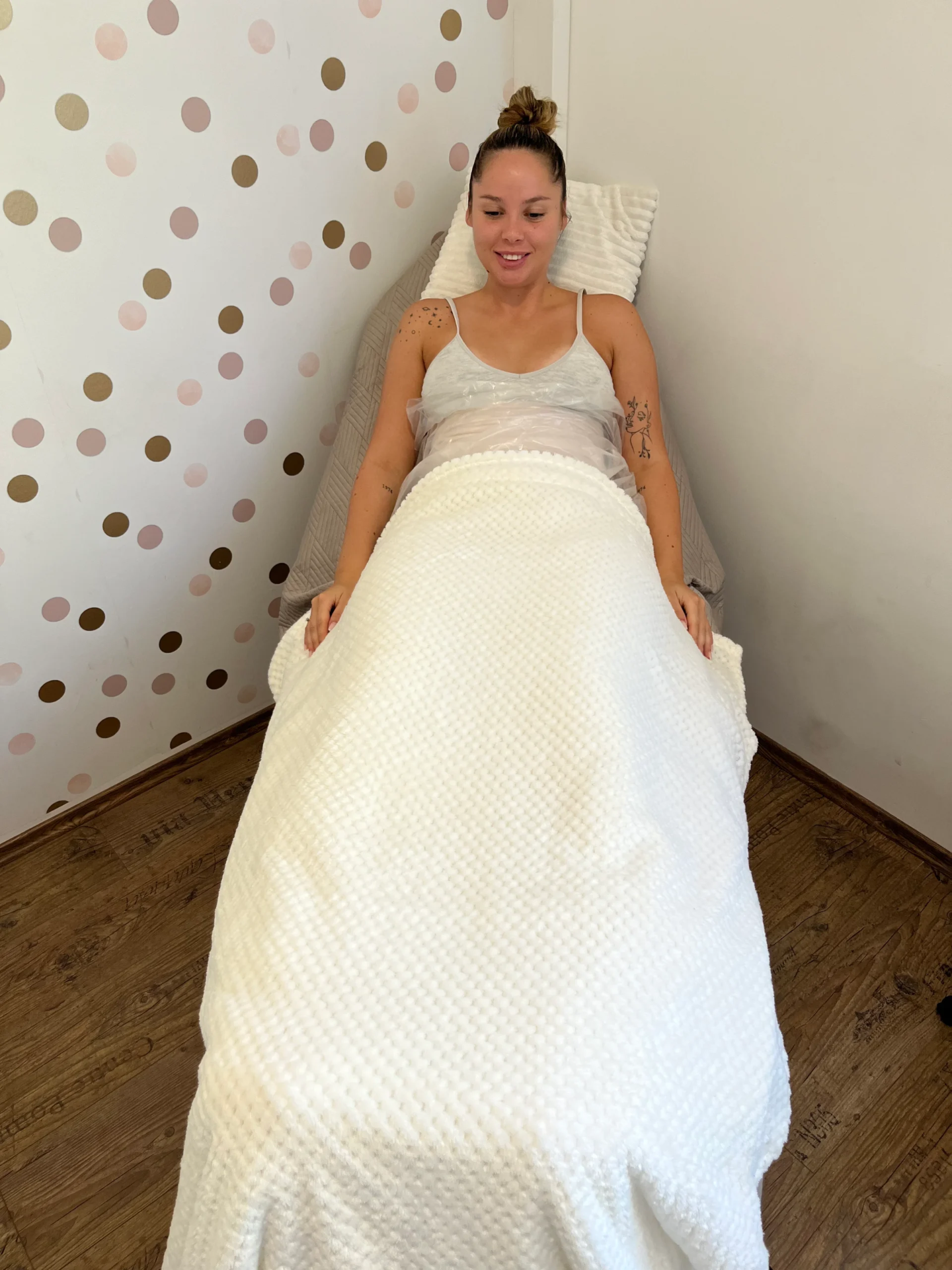 Miután a vendég szakszerűen be lett tekercselve és adtunk rá fólianadrágot, lefektetjük a kezelőágyra és 45 percig hagyjuk pihenni. A megfelelő pihenő idő elengedhetetlenül fontos, hogy a a hatóanyagok maximálisan ki tudják fejteni a hatásukat.
